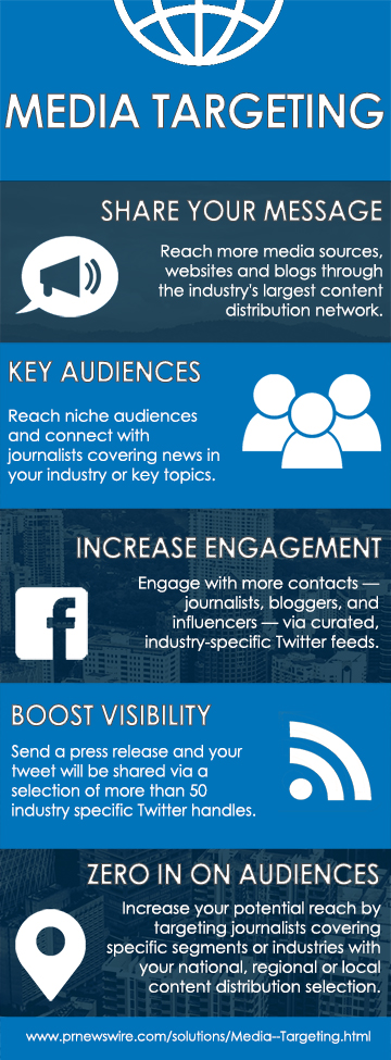 I created this infographic for my Style and Design class. The infographic was made using Adobe Photoshop as well as information published on PR Newswire. For this graphic I chose an image of a city skyline with a blue overlay. I then used solid blue layers to make different sections and help the information flow down the graphic. The content in this infographic is focused on media targeting in five steps - share your message, key audiences, increase engagement, boost visibility and zero in on audience.